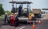 REPUBLIKA.CO.ID,PALEMBANG -- Pekerja dibantu alat berat menyelesaikan pengaspalan Jalan Tol Trans Sumatera ruas Kayu Agung-Palembang (Kapal) di Kabupaten Ogan Komering Ilir (OKI), Sumatera Selatan, Kamis (13/4/2023).
