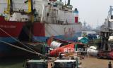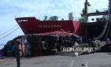 REPUBLIKA.CO.ID,Pekerja mengevakuasi isi muatan truk yang terguling di ramp door Kapal Motor (KM) Mila Utama di Dermaga Jamrud Utara, Pelabuhan Tanjung Perak, Surabaya, Jawa Timur, Jumat (14/4/2023).