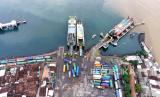 REPUBLIKA.CO.ID,BANYUWANGI -- Foto udara antrean truk di dermaga LCM Pelabuhan Ketapang Banyuwangi, Jawa Timur, Kamis (14/4/2023).