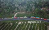 REPUBLIKA.CO.ID,JAMBI -- Foto udara kendaraan yang didominasi truk melintasi Jalan Lintas Sumatera di Sungai Landai, Muaro Jambi, Jambi, Jumat (14/4/2023).
