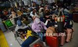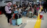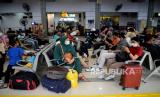 REPUBLIKA.CO.ID, JAKARTA -- Penumpang menunggu kereta api di Stasiun Pasar Senen, Jakarta, Ahad (16/4/2023). Berdasarkan data hari ini, volume penumpang berangkat sudah mengalami peningkatan, tercatat ada sekitar 23.600 penumpang berangkat dari Stasiun Pasar Senen dengan layanan 32 KA yang beroperasi.
