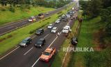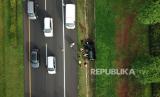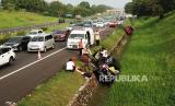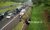 Kemacetan terjadi akibat dua kendaraan mengalami kecelakaan lalu lintas di ruas tol Cipali Km 74 arah Palimanan, Jawa Barat, Selasa (18/4/2023). Satu kendaraan minibus yang mengangkut lima orang pemudik tujuan Ngawi, Jawa Timur itu terlibat kecelakaan dengan mobil truk pengangkut barang. Kecelakaan diduga akibat supir truk mengantuk sehingga lepas kendali dan menabrak mobil minibus. Tidak ada korban jiwa dalam kecelakaan tersebut, namun akibat kecelakaan itu sempat terjadi kemacetan hingga 2 kilometer. (FOTO : Republika/Edwin Dwi Putranto)