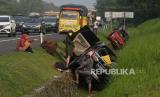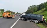 Kendaraan minibus mengalami kecelakaan lalu lintas di ruas tol Cipali Km 74 arah Palimanan, Jawa Barat, Selasa (18/4/2023). Satu kendaraan minibus yang mengangkut lima orang pemudik tujuan Ngawi, Jawa Timur itu terlibat kecelakaan dengan mobil truk pengangkut barang. Kecelakaan diduga akibat supir truk mengantuk sehingga lepas kendali dan menabrak mobil minibus. Tidak ada korban jiwa dalam kecelakaan tersebut, namun akibat kecelakaan itu sempat terjadi kemacetan hingga 2 kilometer. (FOTO : Republika/Edwin Dwi Putranto)