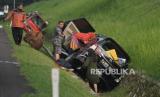 Petugas mengevakuasi kendaraan yang mengalami kecelakaan lalu lintas di ruas tol Cipali Km 74 arah Palimanan, Jawa Barat, Selasa (18/4/2023). Satu kendaraan minibus yang mengangkut lima orang pemudik tujuan Ngawi, Jawa Timur itu terlibat kecelakaan dengan mobil truk pengangkut barang. Kecelakaan diduga akibat supir truk mengantuk sehingga lepas kendali dan menabrak mobil minibus. Tidak ada korban jiwa dalam kecelakaan tersebut, namun akibat kecelakaan itu sempat terjadi kemacetan hingga 2 kilometer. (FOTO : Republika/Edwin Dwi Putranto)