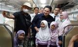 Menteri BUMN Erick Thohir berfoto bersama pemudik saat meninjau langsung kesiapan layanan PT KAI dalam menghadapi arus mudik lebaran 1444 Hijriah di Stasiun Pasar Senen, Jakarta, Selasa (18/4/2023). (FOTO : Dok. Republika)