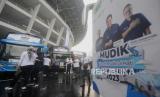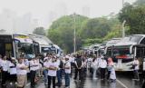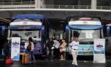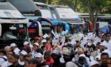 Sejumlah pemudik bergegas memasuki bus saat pelepasan program Mudik Bersama BUMN 2023 di Gelora Bung Karno, Jakarta, Selasa (18/4/2023). Sebanyak 78.017 pemudik mengikuti program Mudik Bersama BUMN 2023 yang bertajuk Mudik Dinanti Mudik di Hati yang merupakan salah satu implementasi bakti BUMN sebagai bentuk Tanggung Jawab Sosial dan Lingkungan. (FOTO : Republika/Putra M. Akbar)