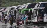 Sejumlah pemudik menunggu waktu keberangkatan bus saat pelepasan program Mudik Bersama BUMN 2023 di Gelora Bung Karno, Jakarta, Selasa (18/4/2023). Sebanyak 78.017 pemudik mengikuti program Mudik Bersama BUMN 2023 yang bertajuk Mudik Dinanti Mudik di Hati yang merupakan salah satu implementasi bakti BUMN sebagai bentuk Tanggung Jawab Sosial dan Lingkungan. (FOTO : Republika/Putra M. Akbar)