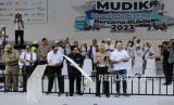 Menteri BUMN Erick Thohir (ketiga kanan) bersama Menteri Perhubungan Budi Karya Sumadi (ketiga kiri), Kakorlantas Polri Irjen Pol Firman Shantyabudi (kedua kanan) dan Direktur Utama PT Jasa Raharja Rivan Achmad Purwantono (kanan) saat pelepasan program Mudik Bersama BUMN 2023 di Gelora Bung Karno, Jakarta, Selasa (18/4/2023). Sebanyak 78.017 pemudik mengikuti program Mudik Bersama BUMN 2023 yang bertajuk Mudik Dinanti Mudik di Hati yang merupakan salah satu implementasi bakti BUMN sebagai bentuk Tanggung Jawab Sosial dan Lingkungan. (FOTO : Republika/Putra M. Akbar)