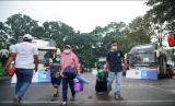 Suasana para pemudik yang turut serta dalam Program Mudik Bersama BUMN 2023 menggunakan bus dari Telkom Group di Istora Senayan, Gelora Bung Karno Jakarta, Selasa (18/4). (FOTO : Dok Republika )
