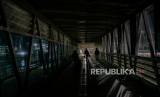 Pemudik berjalan diatas jembatan penghubung dermaga di Pelabuhan Merak, Cilegon, Banten, Selasa (18/4/2023). (FOTO : Republika/Thoudy Badai)