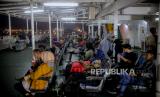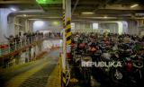Pemudik motor antre saat menaiki kapal di Pelabuhan Ciwandan, Cilegon, Banten, Rabu (19/4/2023) dini hari. Peningkatan jumlah pemudik motor pada Rabu (19/4) dini hari terjadi di Pelabuhan Ciwandan. Sejunlah pemudik mulai memadati area pelabuhan sekitar pukul 00.00 WIB. Sementara berdasarkan data dari Pelindo, sebanyak 12.657 unit sepeda motor yang menyeberang dari Pelabuhan Ciwandan menuju Sumatera sejak sabtu (15/4) hingga Selasa (18/4) sore. Puncak arus mudik di Pelabuhan Ciwandan diprediksi terjadi pada hari ini Rabu (19/4). (FOTO : Republika/Thoudy Badai)