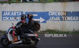 Pengendara motor melintas di dekat petunjuk arah di kawasan Simpang Jomin, Karawang, Jawa Barat, Rabu (19/4/2023). Lalu lintas di kawasan Simpang Jomin terpantau ramai lancar dari pemudik yang akan menuju ke arah Jawa Tengah. (FOTO : Republika/Putra M. Akbar)