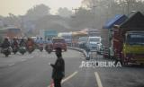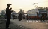 Petugas mengatur lalu lintas di kawasan Simpang Jomin, Karawang, Jawa Barat, Rabu (19/4/2023). Lalu lintas di kawasan Simpang Jomin terpantau ramai lancar dari pemudik yang akan menuju ke arah Jawa Tengah. (FOTO : Republika/Putra M. Akbar)