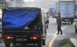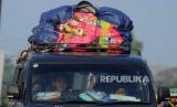 Sejumlah pemudik berada di dalam mobil bak saat melintasi kawasan Simpang Jomin, Karawang, Jawa Barat, Rabu (19/4/2023). Lalu lintas di kawasan Simpang Jomin terpantau ramai lancar dari pemudik yang akan menuju ke arah Jawa Tengah. (FOTO : Republika/Putra M. Akbar)