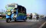 Pemudik menggunakan bajaj saat melintasi kawasan Simpang Jomin, Karawang, Jawa Barat, Rabu (19/4/2023). Lalu lintas di kawasan Simpang Jomin terpantau ramai lancar dari pemudik yang akan menuju ke arah Jawa Tengah. (FOTO : Republika/Putra M. Akbar)