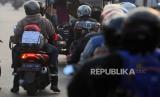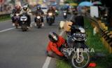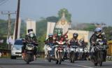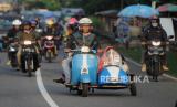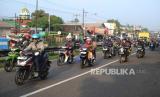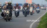 Pemudik mengendarai vespa di kawasan Simpang Jomin, Karawang, Jawa Barat, Rabu (19/4/2023). Lalu lintas di kawasan Simpang Jomin terpantau ramai lancar dari pemudik yang akan menuju ke arah Jawa Tengah. (FOTO : Republika/Putra M. Akbar)