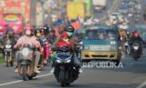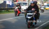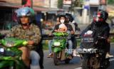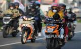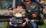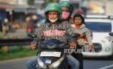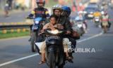 Pemudik motor berboncengan dengan anaknya saat melewati Simpang Jomin, Karawang, Jawa Barat, Rabu (19/4/2023). Menteri Pemberdayaan Perempuan dan Perlindungan Anak Bintang Puspayoga mengimbau masyarakat yang mudik menggunakan sepeda motor agar tidak membawa anak untuk mengurangi resiko kecelakaan saat perjalanan panjang menuju kampung halaman. (FOTO : Republika/Putra M. Akbar)