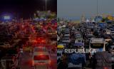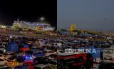 Foto dyptich deretan kendaraan pemudik antre saat akan menaiki kapal pada dini hari dan pagi di Dermaga 5 Pelabuhan Merak, Cilegon, Banten, Rabu (19/4/2023). (FOTO : Republika/Thoudy Badai)