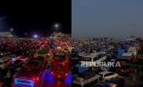 REPUBLIKA.CO.ID, CILEGON -- Foto dyptich deretan kendaraan pemudik antre saat akan menaiki kapal pada dini hari dan pagi di Dermaga 5 Pelabuhan Merak, Cilegon, Banten, Rabu (19/4/2023).