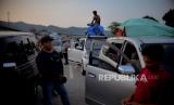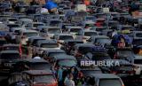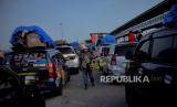 Dereta kendaraan pemudik antre sebelum menaiki kapal di Dermaga 5 Pelabuhan Merak, Cilegon, Banten, Rabu (19/4/2023). (FOTO : Republika/Thoudy Badai)