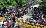 Ratusan pemudik tanpa membawa kendaraan tujuan Kabupaten Konawe Kepulauan tersebut terpaksa mengantre untuk menghindari kelebihan muatan kapal.