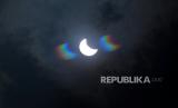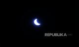 Puncak gerhana matahari hibrida terlihat dari Masjid Islamic Center UAD, Yogyakarta, Kamis (21/4/2023). Beberapa masjid di Yogyakarta menggelar shalat sunah kusuf karena adanya gerhana matahari hibrida. Setalah shalat gerhana, warga beramai-ramai melihat gerhana dengan kacamata khusus. (FOTO : Republika/Wihdan Hidayat)