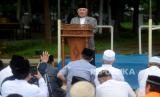 Mantan Ketua Umum PP Muhammadiyah Din Syamsuddin menyampaikan khutbah Idul Fitri 1444 H di halaman parkir Jakarta International Equestrian Park, Pulomas, Jakarta, Jumat (21/4/2023). Dalam khutbahnya Din menekankan pentingnya persatuan umat Islam di tengah perbedaan pelaksanaan Shalat Id, pandangan, maupun partai politik. (FOTO : Republika/Prayogi)