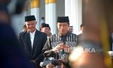Presiden Joko Widodo bersama Gubernur Jawa Tengah Ganjar Pranowo menjawab pertanyaan wartawan usai menunaikan Sholat Idul Fitri di Masjid Raya Sheikh Zayed, Surakarta, Jawa Tengah, Sabtu (22/4/2023). (FOTO : Republika/Wihdan Hidayat)