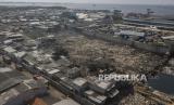 Foto udara kondisi rumah padat penduduk yang terdampak kebakaran di Muara Angke, Penjaringan Jakarta Utara, Sabtu (22/4/2023). (FOTO : ANTARA FOTO)