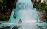 Wisatawan menaiki wahana Racer Slide di The Jungle Waterpark, Kota Bogor, Jawa Barat, Ahad (23/4/2023). Hari libur Lebaran 1444 Hijriah dimanfaatkan oleh warga untuk mengunjungi objek wisata. Tercatat selama dua hari sekitar 4.500 wisatawan baik dari wilayah Jabodetabek maupun luar kota mengunjungi The Jungle Waterpark yang menyediakan berbagai macam wahana permainan air. (FOTO : Republika/Putra M. Akbar)