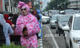Pocong Pink gentayangan di kawasan Jalan Asia Afrika, Kota Bandung, menyapa pengunjung dan pengendara, Ahad (23/4/2023). (FOTO : Edi Yusuf/Republika)