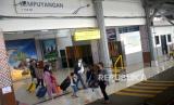 Penumpang kereta api jarak jauh mulai memasuki Stasiun Lempuyangan, Yogyakarta, Senin (24/4/2023). (FOTO : Republika/Wihdan Hidayat)