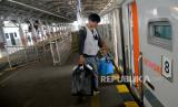 Penumpang KA Progo menata barang bawaan di Stasiun Lempuyangan, Yogyakarta, Senin (24/4/2023). (FOTO : Republika/Wihdan Hidayat)