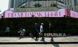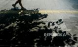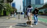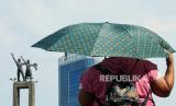 Warga beraktivitas saat cuaca terik di kawasan Bundaran Hotel Indonesia, Jakarta, Senin (24/4/2023). (FOTO : Republika/Thoudy Badai)