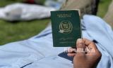 Migran yang telah diselamatkan menunjukkan paspor berkewarganegaraan Pakistan setelah kapal mereka tenggelam di Mediterania, tiba dengan kapal di pelabuhan Garaboli, sebelah timur Tripoli, Libya, (25/4/2023). (FOTO : EPA-EFE/STRINGER)