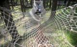 Anak-anak bermain jembatan jaring saat berwisata ke Hutan Pinus Mangunan, Bantul, Yogyakarta, Kamis (27/4/2023). (FOTO : Republika/Wihdan Hidayat)