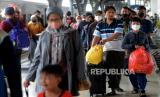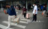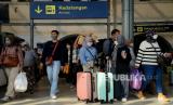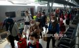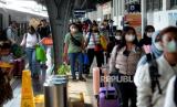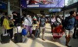 Sejumlah penumpang kereta api berjalan setibanya di Stasiun Pasar Senen, Jakarta, Kamis (27/4/2023). Sejak 24 April 2023 angka penumpang yang tiba di area Daop 1 Jakarta mulai mengalami peningkatan, secara total pada hari ini Kamis 27 April 2023 terdapat sekitar 43.500 pengguna yang tiba. Dari jumlah tersebut 16.000 merupakan penumpang turun di Stasiun Pasar Senen, 15.900 penumpang turun di Stasiun Gambir, 4500 penumpang di Stasiun Bekasi, 4.600 penumpang di Stasiun Jatinegara dan sisanya penumpang turun di Stasiun Jakarta Kota, Cikarang, Karawang dan Cikampek. Jumlah tersebut mengalami peningkatan hingga 2x lipat dari masa normal. (FOTO : Republika/Prayogi)