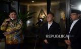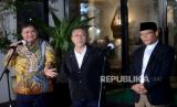 Ketua Umum PAN Zulkifli Hasan (tengah) bersama Ketua Umum Partai Golkar Airlangga Hartarto (kiri) dan Plt Ketua Umum PPP Mardiono (kanan) memberikan keterangan kepada wartawan saat silaturahmi Koalisi Indonesia Bersatu (KIB) di kediaman Airlangga Hartarto, di Jakarta, Kamis (27/4/2023). Dalam kesempatan tersebut ditegaskan bahwa KIB masih solid usai keputusan PPP mendukung Ganjar Pranowo sebagai bakal calon presiden pada pilpres 2024. Selain itu KIB juga tidak akan mencampuri urusan internal partai masing-masing. (FOTO : Republika/Prayogi)
