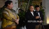 Plt Ketua Umum PPP Mardiono (kanan) bersama Ketua Umum Partai Golkar Airlangga Hartarto (kiri) dan Ketua Umum PAN Zulkifli Hasan memberikan keterangan kepada wartawan saat silaturahmi Koalisi Indonesia Bersatu (KIB) di kediaman Airlangga Hartarto, di Jakarta, Kamis (27/4/2023). Dalam kesempatan tersebut ditegaskan bahwa KIB masih solid usai keputusan PPP mendukung Ganjar Pranowo sebagai bakal calon presiden pada pilpres 2024. Selain itu KIB juga tidak akan mencampuri urusan internal partai masing-masing. (FOTO : Republika/Prayogi)