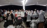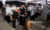 Jamaah umroh Abhinaya PT Dava Tour & Travel bersiap memasuki Terminal 3 Bandara Internasional Soekarno-Hatta, Tangerang, Banten, Sabtu (29/4/2023). (FOTO : Republika/Prayogi)