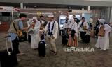 Jamaah umroh Abhinaya PT Dava Tour & Travel bersiap gate keberangkatan di Terminal 3 Bandara Internasional Soekarno-Hatta, Tangerang, Banten, Sabtu (29/4/2023). (FOTO : Republika/Prayogi)