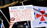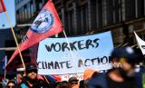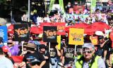REPUBLIKA.CO.ID,SYDNEY -- Para pekerja memegang tanda dan bendera saat pawai May Day, sebagai bagian dari Hari Buruh, di Sydney, Australia, Senin (1/5/2023).