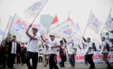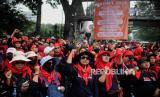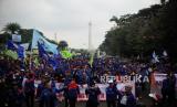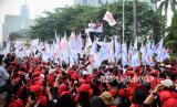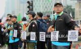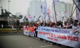 Sejumlah buruh saat melakukan aksi di kawasan Patung Kuda, Jakarta, Senin (1/5/2023). Aksi yang dilakukan dalam rangka peringatan Hari Buruh memberikan sejumlah tuntutan diantaranya meminta pemerintah untuk mencabut Omnibus Law UU No 6 Tahun 2023 tentang Ciptaker, cabut parliamentary threshold 4 persen dan Presidential threshold 20 persen, sahkan RUU DPR dan perlindungan pekerja rumah tangga, tolak RUU Kesehatan, Reforma Agraria dan kedaulatan pangan serta hapus outsourcing tolak upah murah. (FOTO : Republika/Putra M. Akbar)