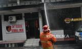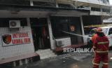 Petugas pemadam kebakaran melakukan pendinginan salah satu ruangan yang terdampak kebakaran di Markas Polsek Bekasi Kota, Jawa Barat, Senin (1/5/2023). Menurut petugas pemadam kebakaran kejadian terjadi pada pukul 11.45 WIB dan penyebab kebakaran masih penyelidikan pihak terkait. (FOTO : Antara/Fakhri Hermansyah)