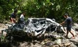 Sejumlah warga mengamati bangkai mobil yang terseret arus banjir bandang di Sembahe, Deli Serdang, Sumatera Utara, Senin (1/5/2023). Berdasarkan data Badan Penanggulangan Bencana Daerah (BPBD) Provinsi Sumatera Utara, banjir bandang yang terjadi pada Minggu 30 April 2023 tersebut mengakibatkan sejumlah fasilitas wisata alam pemandian sungai rusak, dua unit rumah rusak dan satu mobil mini bus terseret arus. (FOTO : ANTARA FOTO/Fransisco Carollio)