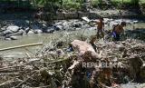 Dua anak berjalan di atas tumpukan material lumpur dan kayu usai banjir bandang di Sembahe, Deli Serdang, Sumatera Utara, Senin (1/5/2023). Berdasarkan data Badan Penanggulangan Bencana Daerah (BPBD) Provinsi Sumatera Utara, banjir bandang yang terjadi pada Minggu 30 April 2023 tersebut mengakibatkan sejumlah fasilitas wisata alam pemandian sungai rusak, dua unit rumah rusak dan satu mobil mini bus terseret arus. (FOTO : ANTARA FOTO/Fransisco Carollio)