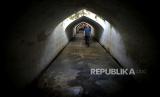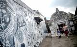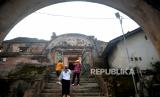 Pemandu menjelaskan sejarah bangunan kepada wisatawan saat berjalan-jalan di kawasan Tamansari, Yogyakarta, Rabu (3/5/2023). Libur Lebaran Idul Fitri 1444H di Daerah Istimewa Yogyakarta lebih sepi dibanding tahun lalu. Dinas Pariwisata DIY memperkirakan kunjungan sebanyak akan meleset dari target sebanyak 5,9 juta wisatawan pada liburan lebaran tahun ini. Layanan kepada wisatawan atau hospitality seperti tarif parkir, harga cenderamata diduga menjadi penyebab turunnya kunjungan wisatawan ini. (FOTO : Republika/Wihdan Hidayat)