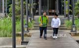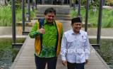 Ketua Umum Partai Golkar Airlangga Hartarto (kiri) bersama Ketua Umum Partai Kebangkitan Bangsa (PKB) Muhaimin Iskandar (kanan) berjalan saat melakukan pertemuan di Jakarta, Rabu (3/5/2023). Pertemuan tersebut dalam rangka halal bi halal sekaligus membahas terkait koalisi partai. (FOTO : Republika/Thoudy Badai)