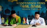 Ketua Umum Partai Golkar Airlangga Hartarto (kiri) bersama Ketua Umum Partai Kebangkitan Bangsa (PKB) Muhaimin Iskandar (kanan) menyampaikan konferensi pers usai melakukan pertemuan di Jakarta, Rabu (3/5/2023). Pertemuan tersebut dalam rangka halal bi halal sekaligus membahas terkait koalisi partai. (FOTO : Republika/Thoudy Badai)