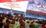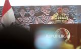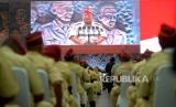 Sambutan Menteri Pertahanan, Prabowo Subianto saat menghadiri reuni akbar dan halal bihalal bersama purnawirawan TNI dan Polri di Jogja Expo Center, Yogyakarta, Rabu (3/5/2023). (FOTO : Republika/Wihdan Hidayat)